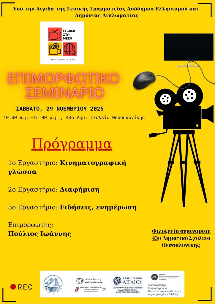 Βιωματικό σεμινάριο Θεσσαλονίκης 11 Νοεμβρίου 2025 Ανακοινώσεις by edu4media Σάββατο 29 Νοεμβρίου 2025, 43ο Δημ. Σχολείο Θεσσαλονίκης (μόνο για όσους/ες έχουν υποβάλλει ηλεκτρονική φόρμα συμμετοχής)
